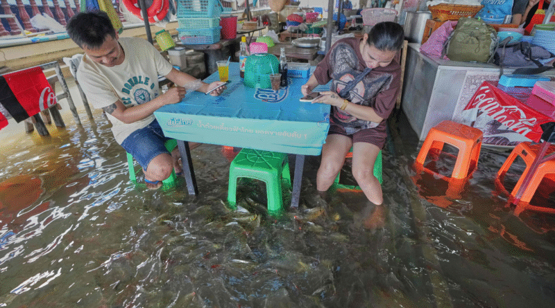 Pemilik restoran, Pornkamol Prangprempree, mengaku awalnya khawatir banjir akan menghancurkan usahanya — sama seperti pengalaman empat tahun lalu ketika restorannya juga sempat kebanjiran.